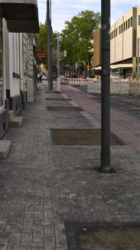 Der aktuelle Baustand an der Düsseldorfer Straße lässt bereits die deutliche Verbesserung mit Verbreiterung des Fußgänger- und Radfahr¬bereiches erkennen. Auf der süd-östlichen Seite ist ein boulevardartiger Bürgersteig entstanden, der Radweg wird auf der Straße geführt werden. Auf der nord-westlichen Seite bestehen wesentlich mehr konkurrierende Nutzungen wie Fu߬gängerweg, Radweg, Geschäfte, Parkstreifen. Leider zeigt die Ausführung dort, dass für die Fu߬gänger an einigen Stellen Engstellen ent¬standen sind. Diese führen bereits jetzt zu Kon¬flikten mit Radfahrern, da die Fußgänger regel¬mäßig auf den Radweg ausweichen (müssen). Dies ist mit dem Ziel eines großzügigen Gehwegs nicht vereinbar. Diese Stellen sollen durch überschaubare bauliche Veränderungen noch während der Bauphase verbessert werden. Im Einzelnen sind dies: 1. Übergroße Baumscheiben (ca. 2,70m x 1,50m) schränken den Fußweg zwischen den Hausnummern 34 und 46 auf unter 1m ein. Durch Hauseingangsstufen und Verteilerkästen bleiben in Einzelfällen weniger als 60 cm für Fußgänger übrig. Die verwaltungsseitig angekündigte Maßnahme, die Baumscheiben mit einem durch Epoxidharz verfestigten Granulat begehungsfähig zu machen, trägt die CDU-Fraktion nicht mit. Diese Vorgehensweise mag in Fällen mit geringem Fußgängeraufkommen akzeptabel sein. Auf der neu geplanten und stark von Fußgängern genutzten Düsseldorfer Straße möchten wir jedoch eine dauerhafte und einheitliche Gehwegausführung. Die Granulatvariante wird sich auf längere Sicht auswaschen, ist dann nicht mehr eben und insbesondere für gehbehinderte Menschen / Rollstuhl- und Rollatornutzer nicht so, wie es bei einer Neugestaltung erwartet werden kann. Zudem entsteht über die Jahre erhöhter Unterhaltungsaufwand. Die CDU schlägt daher vor, entweder die Baumscheiben in dem beengten Bereich entfallen zu lassen (die Bäume stehen ohnehin sehr nahe an den Gebäuden) oder die Baumscheiben – wie vor Haus-Nr. 52 bereits mit ca. 3,10m x 0,9m umgesetzt – um ca. 70 cm schmaler und dafür länger umzubauen. 2. Zwischen Haus-Nr. 46 und 48 steht ein Fahrdrahtmast auf dem nur ca. 60 cm breiten Gehtwegteil, so dass dieser praktisch gar nicht mehr benutzbar ist und permanent auf den Radweg ausgewichen werden muss. Der Fahrdraht¬mast muss um ca. 40 cm in Richtung Haus¬wand Haus-Nr. 48 zu¬rück¬versetzt werden, um die Situation zu bereinigen. Beschlussvorschlag: Die Verwaltung wird beauftragt, 1. den Gehwegbereich um ca. 70 cm zwischen Düsseldorfer Str. 34 und 46 zu Lasten der Baum¬scheiben baulich zu verbreitern und die Baumscheiben – sofern erforderlich –zu verlängern (wie vor Haus-Nr. 52). 2. den Fahrdrahtmast zwischen Haus-Nr. 46 und 48 um ca. 50 cm in Richtung Hauswand Haus-Nr. 48 zu versetzen, um den ohnehin schmalen Gehwegbereich nutzbar zu machen.